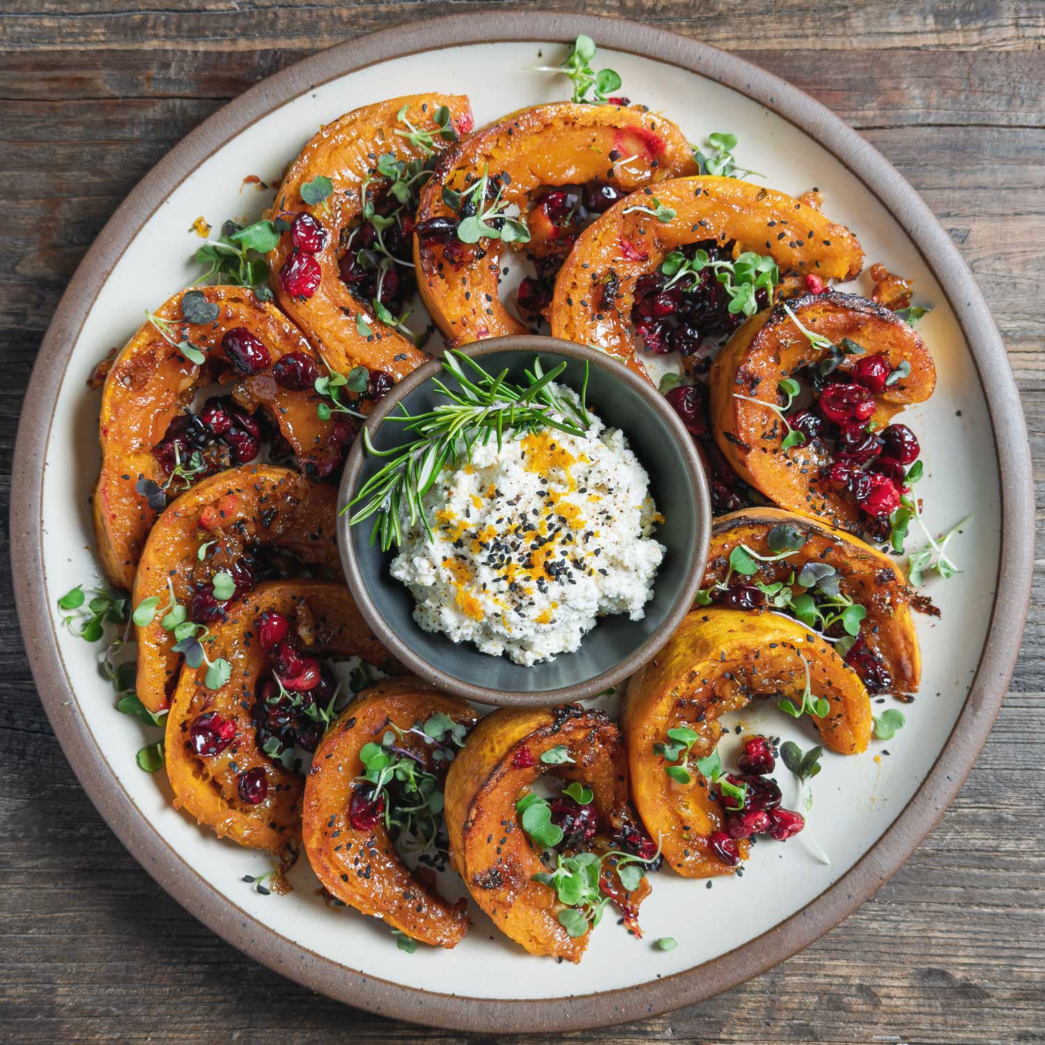 - Scoop the squash and cranberries onto a large platter. Add the bowl of seasoned ricotta to the platter. Spoon the maple syrup over the squash and cranberries. Sprinkle on as many black sesame seeds as you’d like, a little kosher salt, and drizzle with a tablespoon or so of olive oil. Scatter on a handful of microgreens, and a sprig of fresh rosemary, serve, and Enjoy!