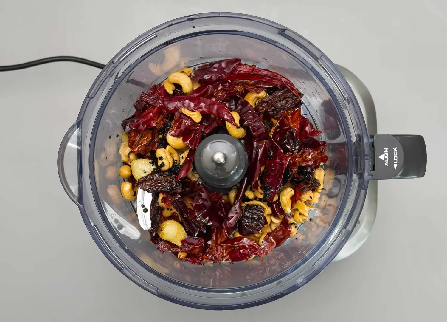 • Add the oil, garlic cloves, and cashews to a medium saucepan and place over medium heat. Cook, stirring occasionally, and adjusting the heat as needed to prevent it from burning, until the garlic cloves begin to turn golden - this took 18 minutes in my 2 quart saucepan. Remove from the heat and add all the dried chiles. Stir for 30 - 45 seconds (the chilies will become fragrant and the oil will have taken on color) and stir in the nigella seeds. * Using a slotted spoon, immediately remove all the solids from the pan to the bowl of a food processor. It’s fine for most of the nigella seeds to remain in the oil. Let cool for about 10 minutes.