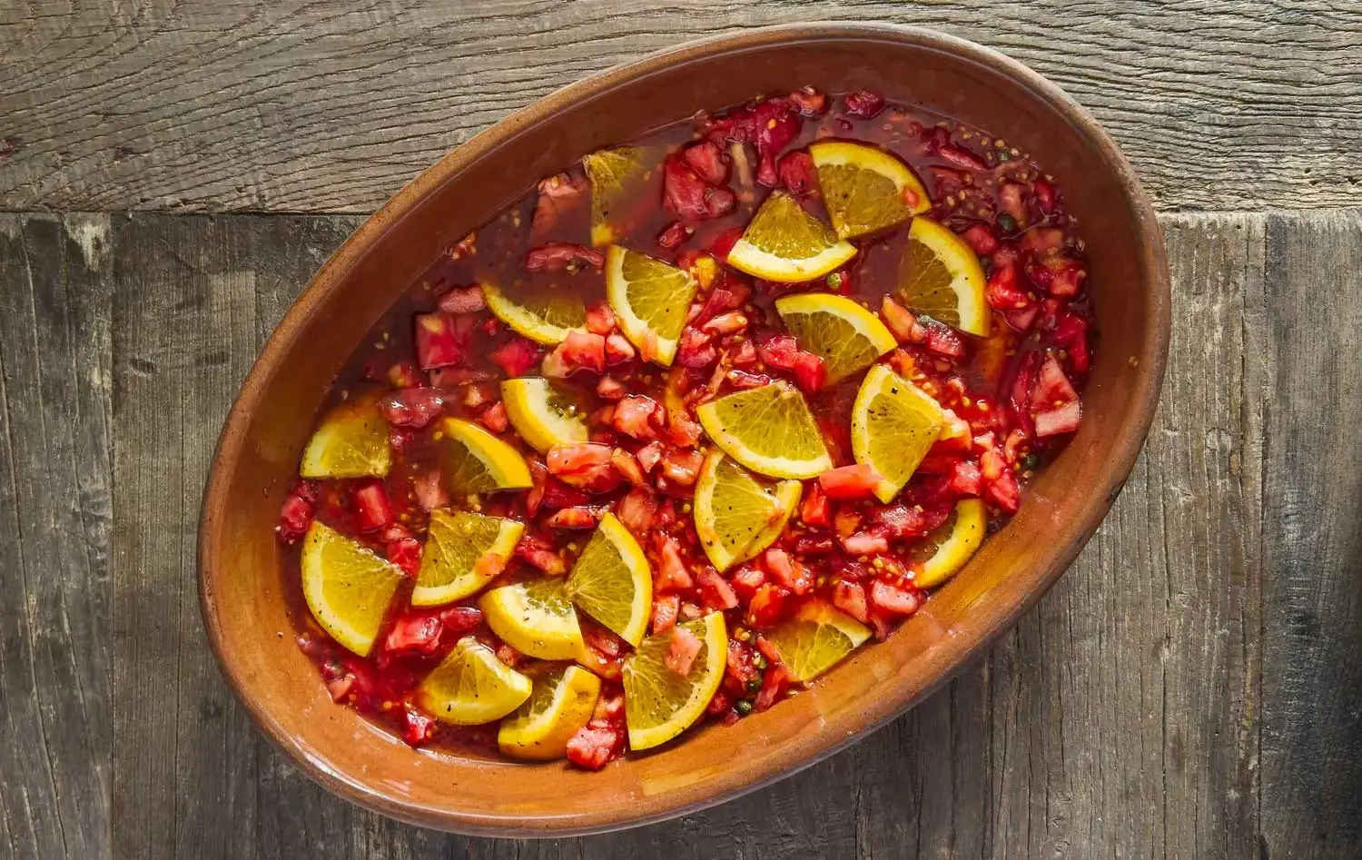 In the meantime, I chopped up all the tomato pulp I’d removed from the insides of the tomatoes and put it into a baking dish. Then I sliced 1 orange into thin wedges and added it to the tomato pulp, along with a tablespoon of tomato vinegar ,* salt and pepper, and a tablespoon of capers. No need to be concerned if you don’t have tomato vinegar * because red wine vinegar is also good in this. It’s what I used the first time I made it, but tomato vinegar adds more tomato flavor.