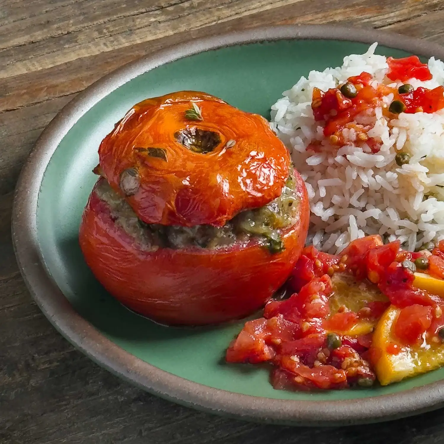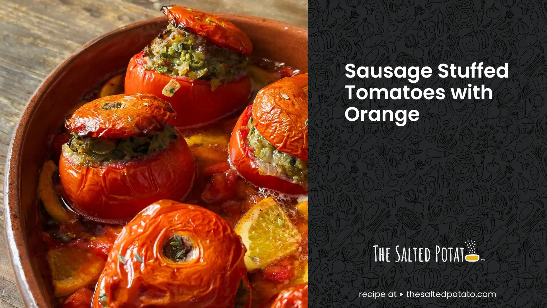 Ripe tomatoes are stuffed with pork sausage, cooked onions, parmesan, and a few other goodies. They're baked on a bed of chopped tomato pulp, sliced oranges, capers, a little vinegar, and seasoning. Talk about great!! The juices alone are worth making the recipe. I promise.