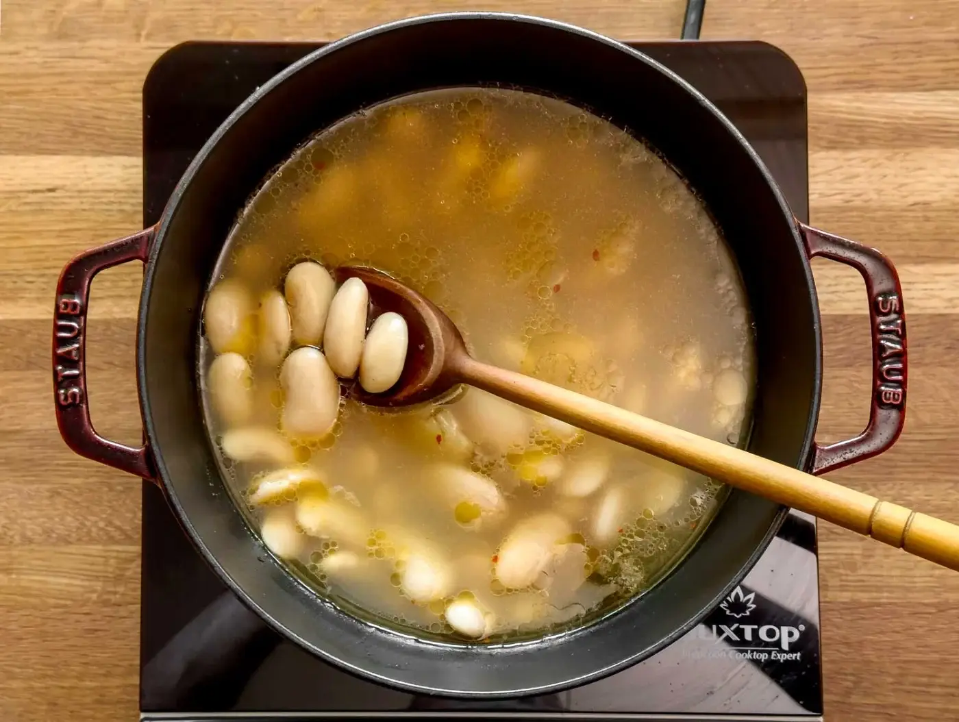 - Drain and rinse the dried brined beans. Place into a 3-4 quart pot, add water to cover by 2 inches. Stir in 1 teaspoon kosher salt, garlic cloves, bay leaves, red pepper flakes, a few grinds of black pepper, and 1 1/2 tablespoons extra virgin olive oil . Bring to a hard boil over high heat and let cook for 5 minutes. Cover the pot and adjust the heat in order to maintain a steady low simmer. Cook until they are thoroughly softened (mine took almost an hour). They should be creamy on the inside. Set aside and allow them to completely cool to room temperature. Strain the beans out of their liquid. I save the liquid for soup later on in the week.