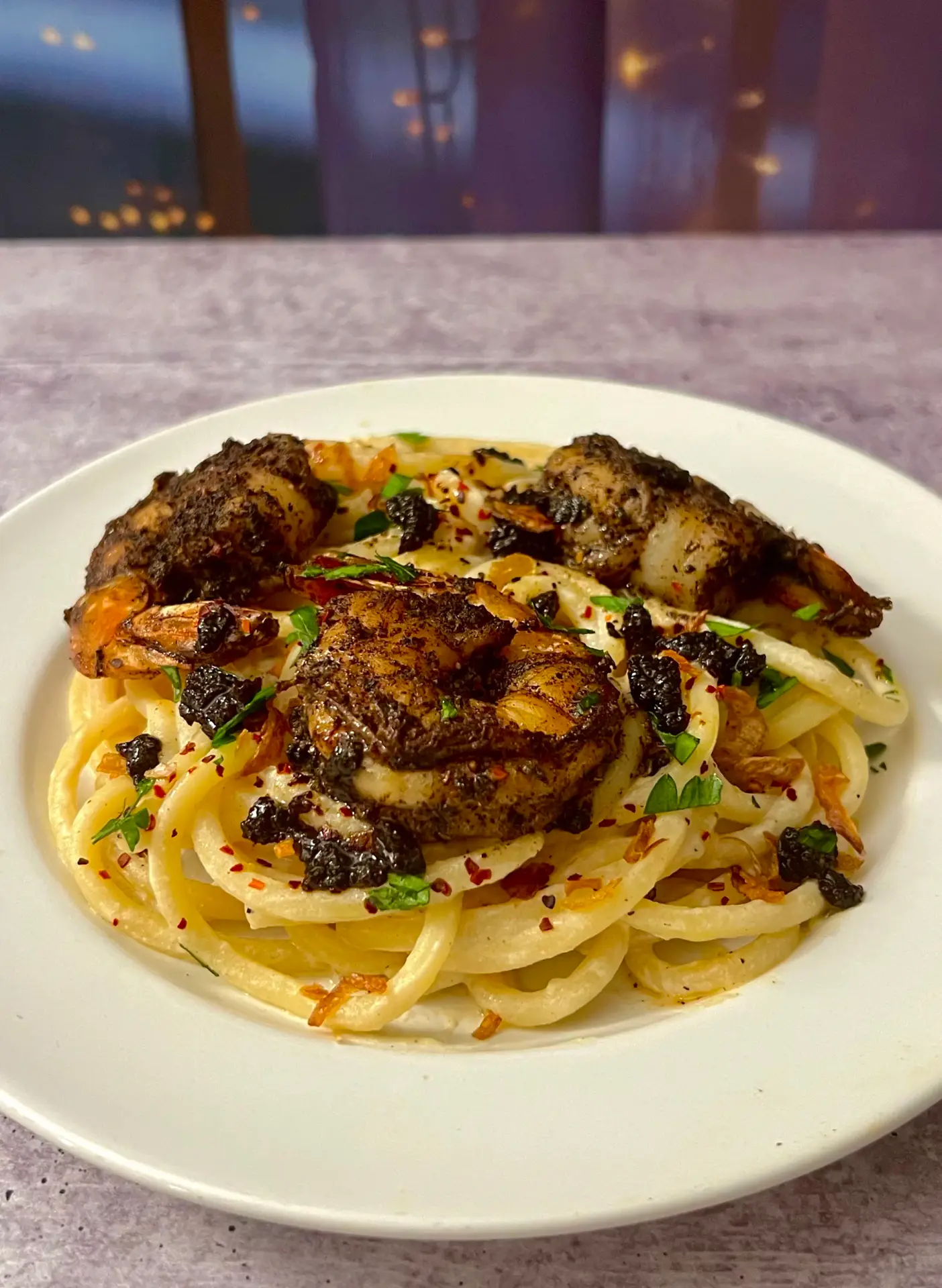 - Serve the pasta, topped with the shrimp, sprinkled with red pepper flakes, and drizzled with some of the black garlic oil and solids. Scatter the parsley over the top and optional crispy fried shallots. I forgot to add the fried shallots when I took the photo. Enjoy!