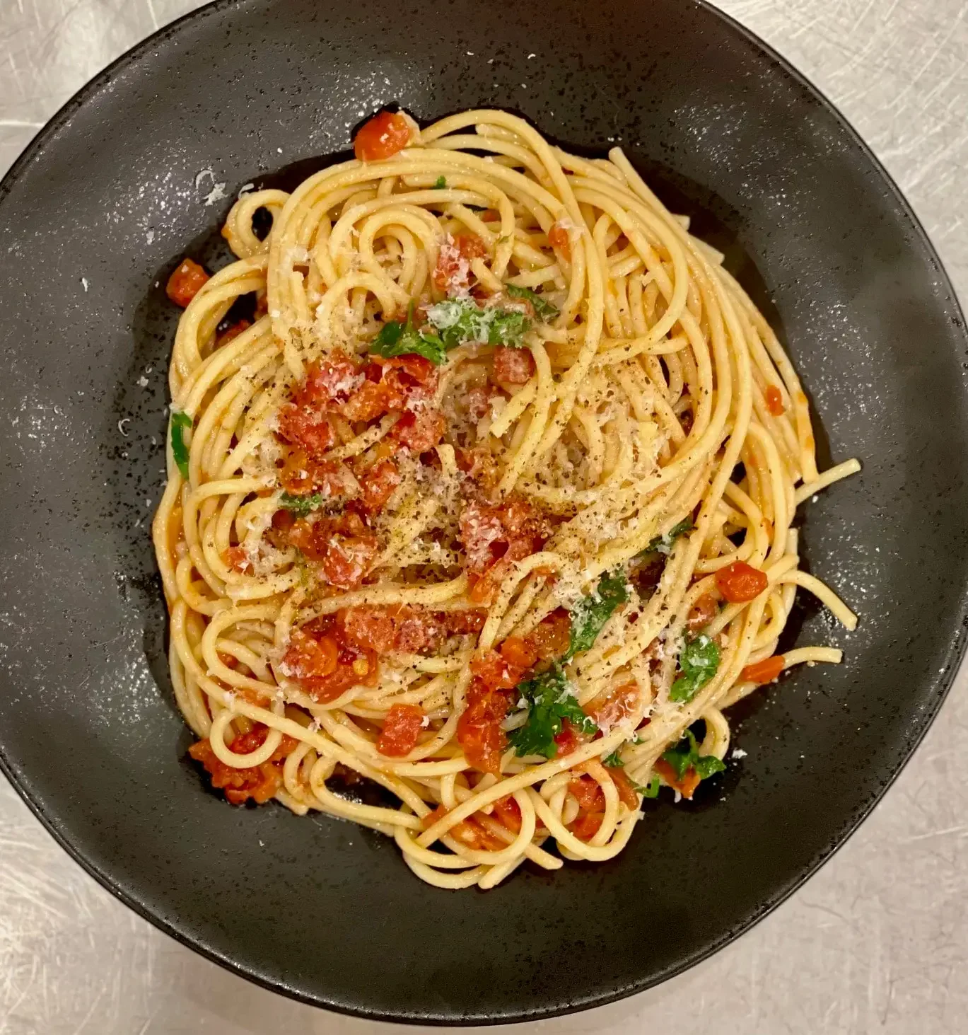 - Add the drained pasta to the pan of sauce. Toss and stir, adding the pasta cooking water if it seems a little dry. Add the parsley at the end while reserving a couple tablespoons to sprinkle on each serving. Drizzle with extra virgin olive oil, more black pepper and the pecorino cheese. Enjoy!