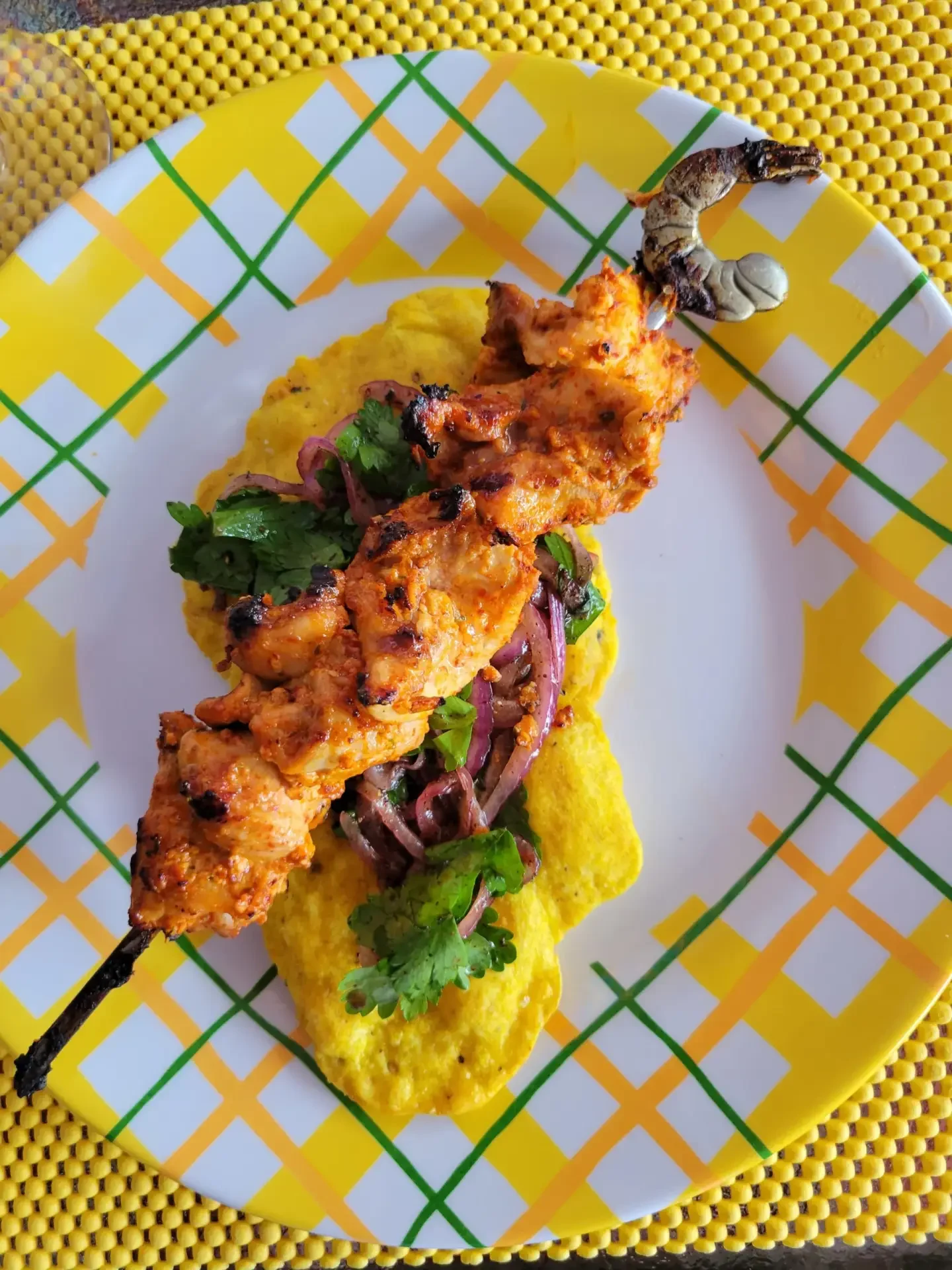 This plate of food is a mix of cultures and began with my craving for chicken kebabs. I knew what flavors I wanted for the kebabs, and also intended to make a flatbread of some sort to wrap up those chunks of chicken. I love to bake breads and flatbreads are one of my favorites. While trying to decide which recipe to use, I happened across one for a type of flatbread I’d never encountered called bara. It’s a fried bread and from what I read it is typically found in Guyanese street food and India, among other places. The particular recipe I selected hails from Trinidad, where the bara are served 2 at a time with a chickpea filling, and are called Doubles.