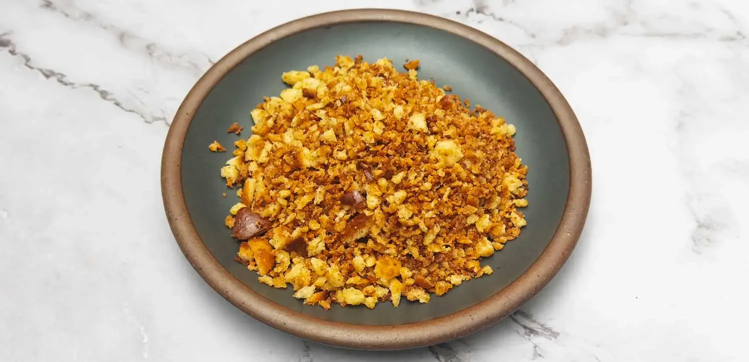 - In a large skillet, toss together the breadcrumbs, 1 tablespoon olive oil, and a generous pinch of salt. Place over medium heat and stir until the breadcrumbs become golden brown and crisp. Remove from the heat, set aside and allow to cool to room temperature.
