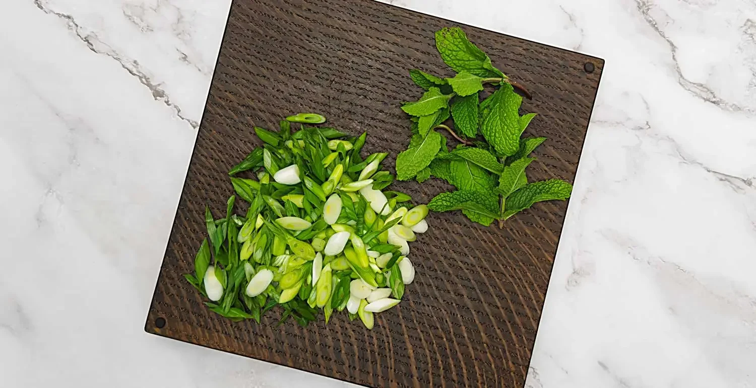 I happen to be growing a pot of mojito mint right now and that’s what I used here. I really love this type of fresh mint. It’s milder than peppermint or spearmint, but it’s sweeter and kind of citrusy. Any kind of fresh mint works, but keep in mind the strength of the flavor and use whatever amount you like. Same goes for the scallions. I like a lot, so I used an entire bunch, but you should use however many suit your personal taste.