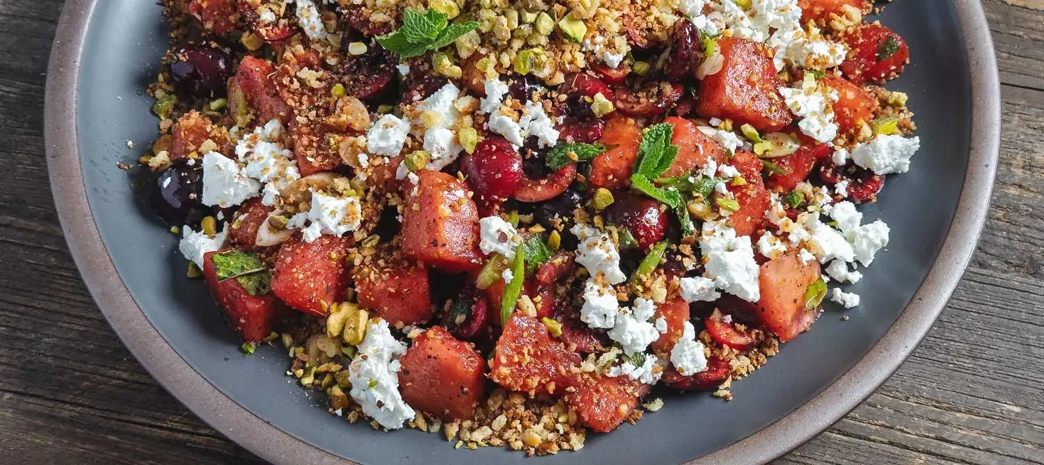 Watermelon, Cherry, and Feta Salad with Crispy Breadcrumbs